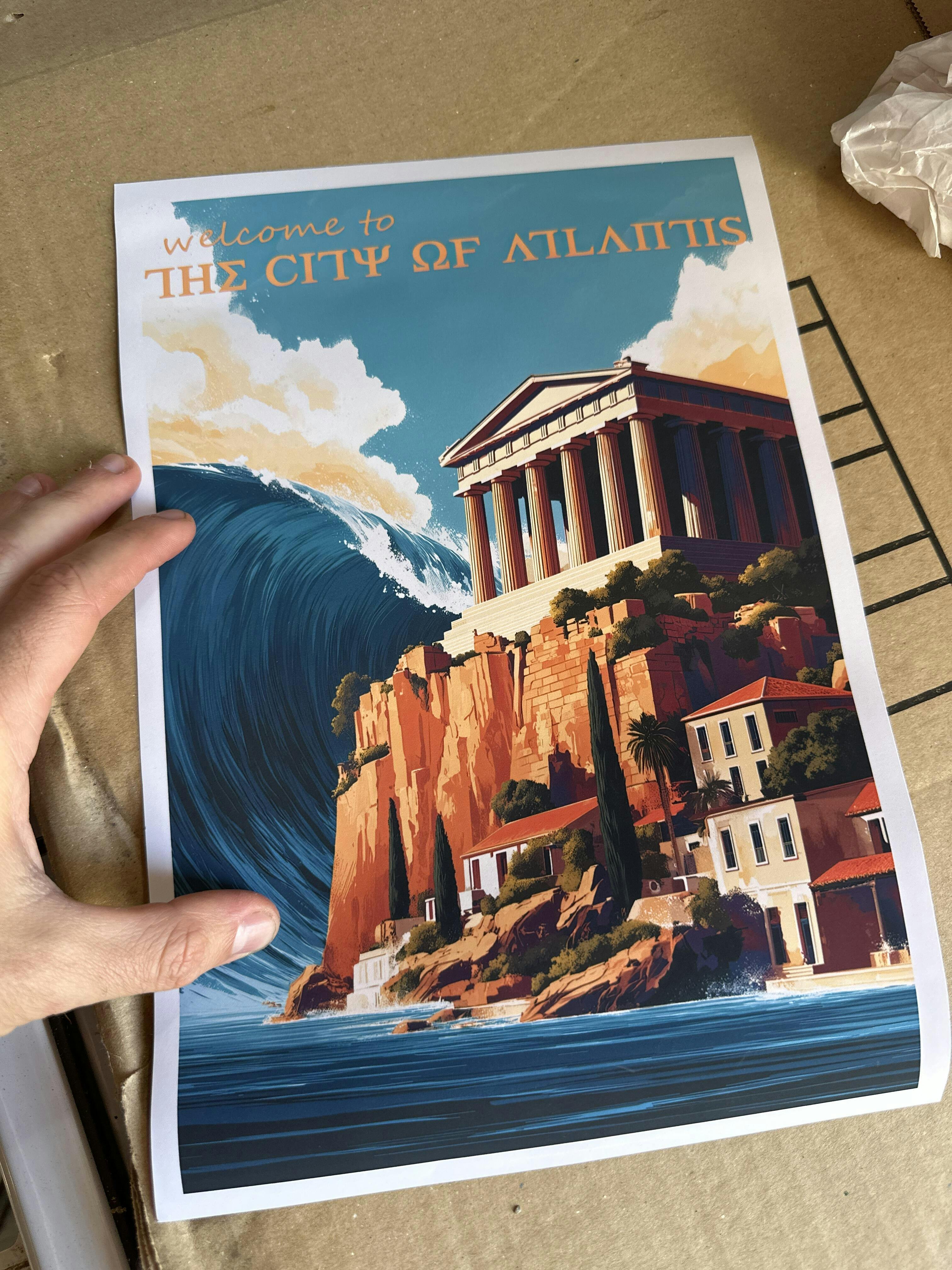 Bring mythology to your walls with this minimalist vintage poster of Atlantis. Featuring elegant temples on the coastline as a massive tidal wave rises to engulf the lost city, this dramatic wall art combines bold flat colors, clean lines, and a timeless retro style. Perfect for lovers of history, legends, and unique home decor.